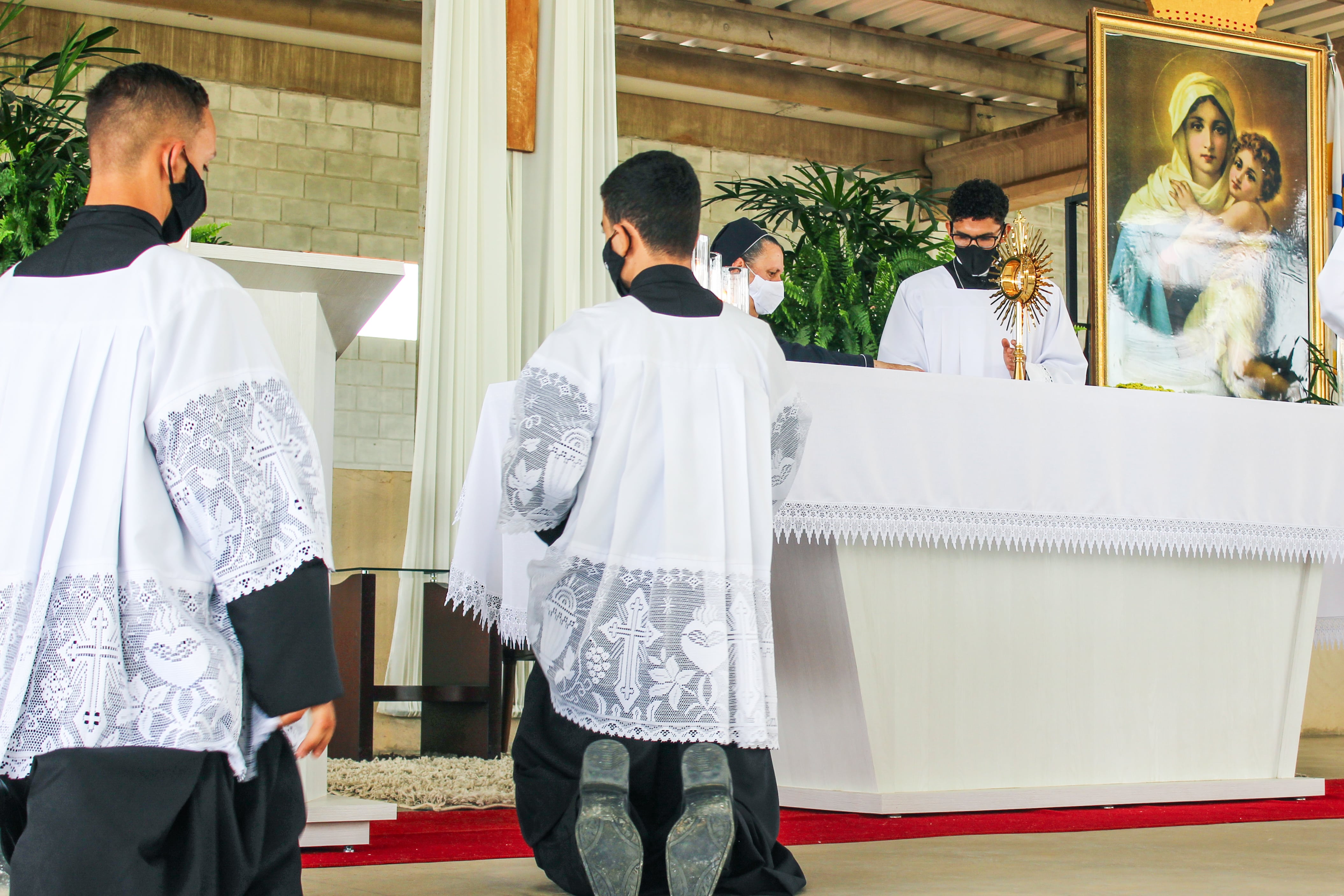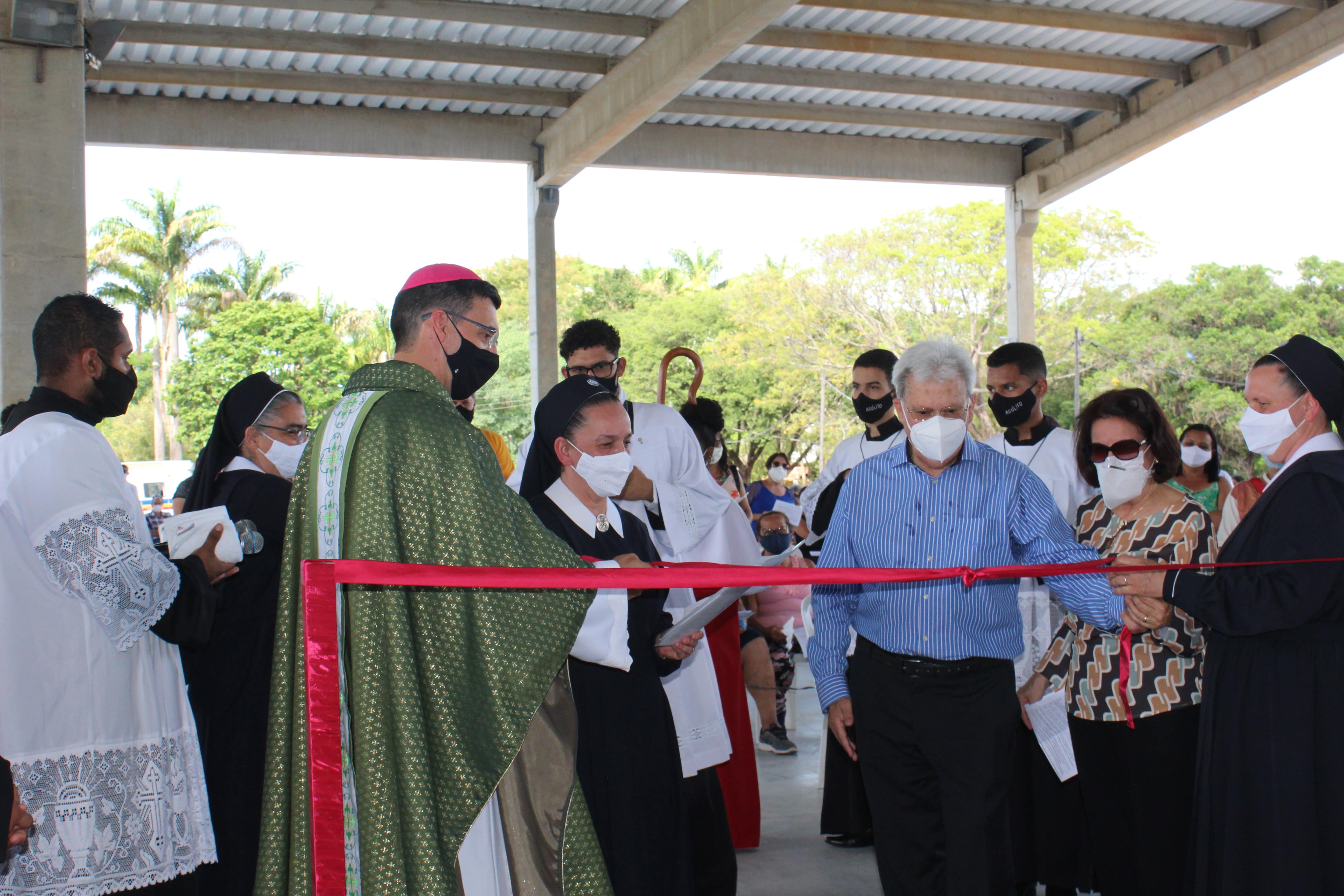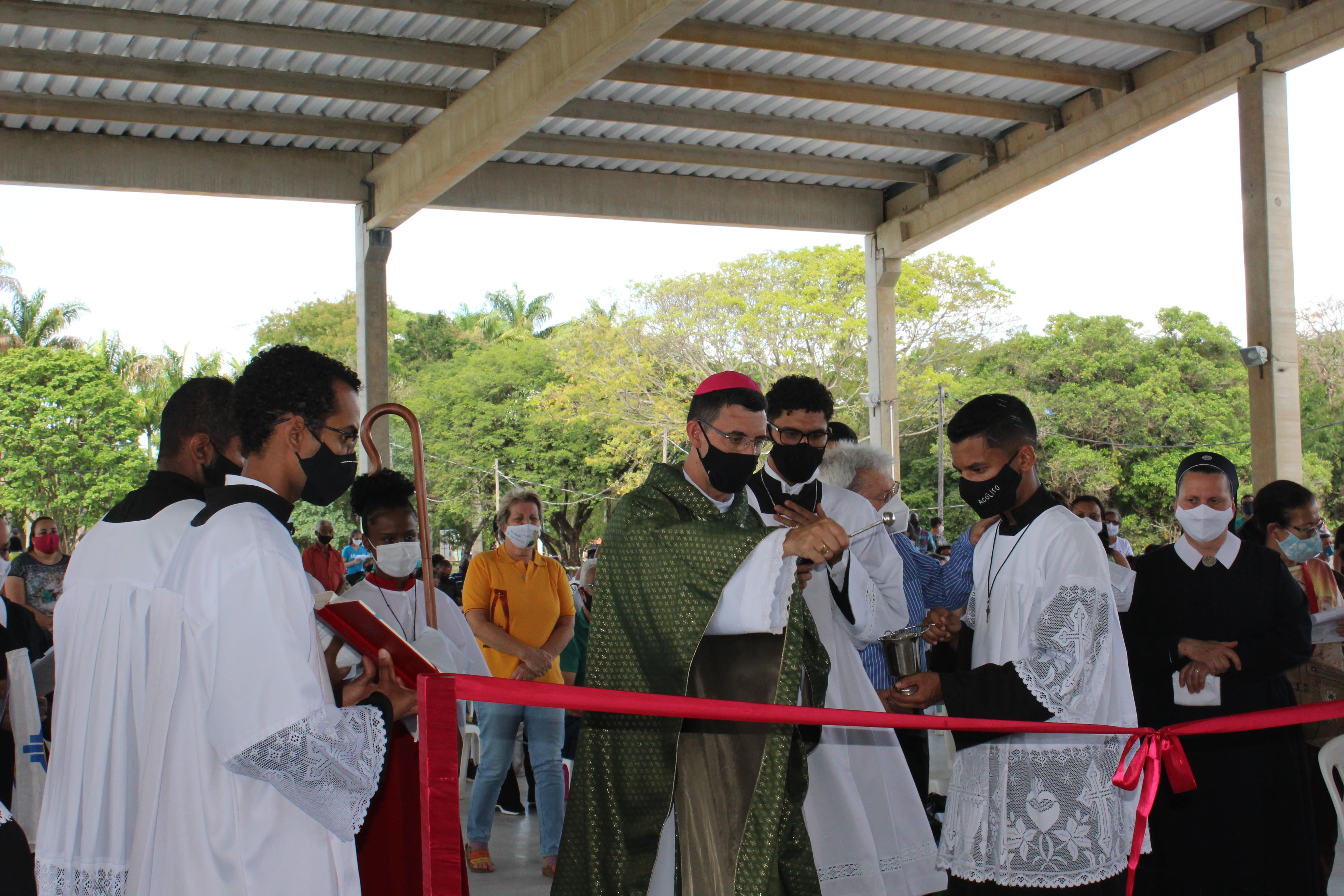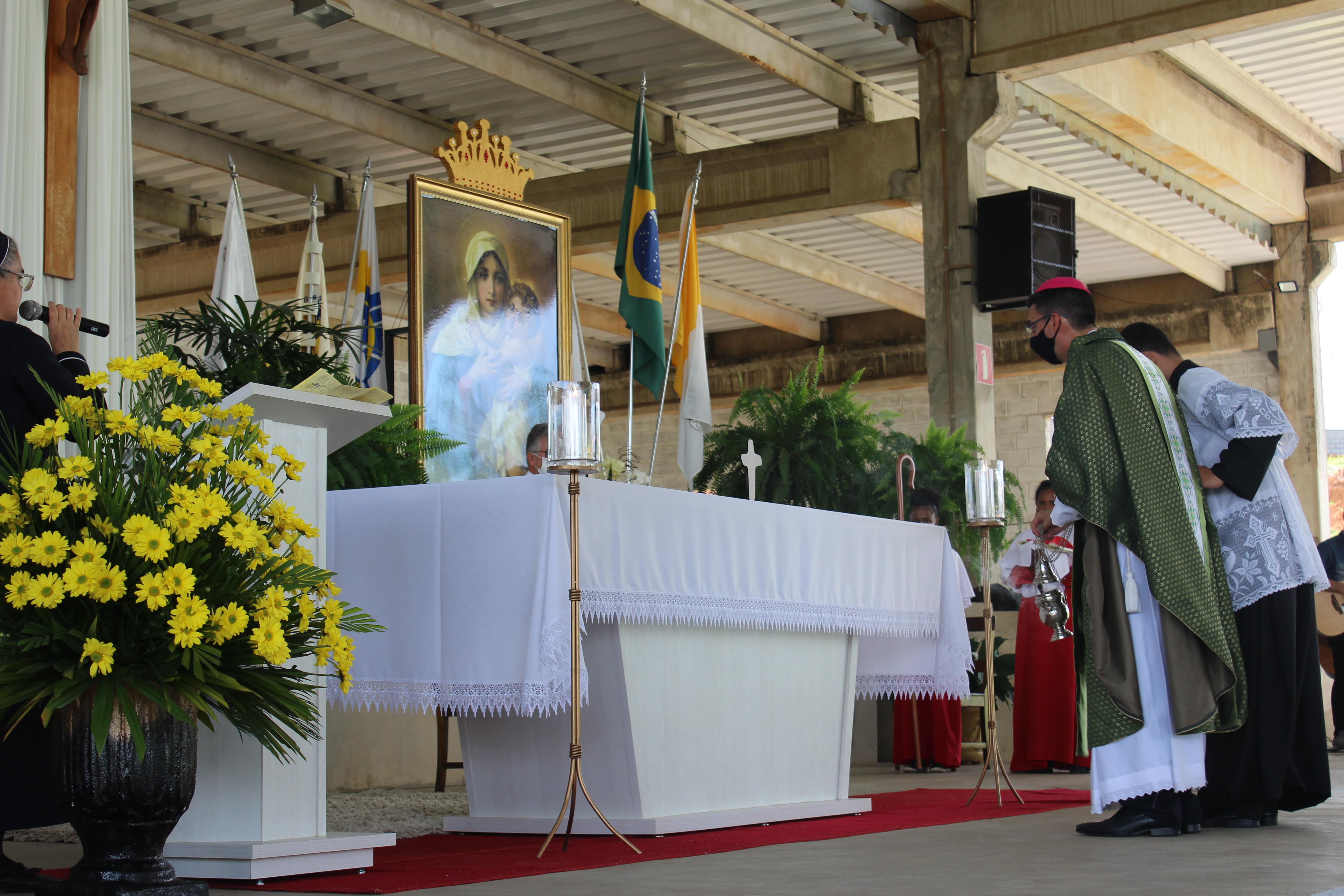 Com muita gratidão, antes da Missa, Dom Júlio César Gomes Moreira, bispo auxiliar da Região Episcopal Nossa Senhora da Conceição da Arquidiocese de Belo Horizonte solenemente abençoou a tão esperada construção do piso da tenda, obra tanto almejada pela Família de Schoenstatt e por cada peregrino que frequenta o Santuário.